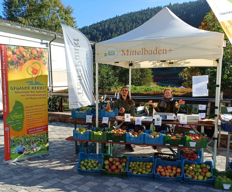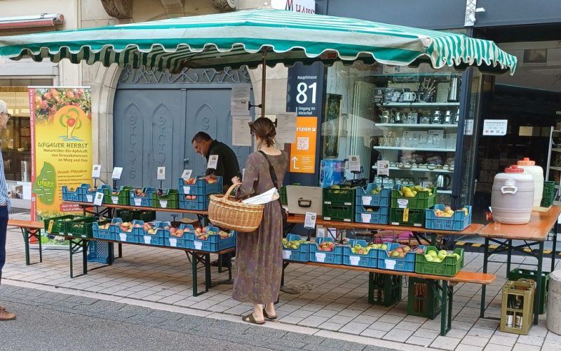 Wir konnten auch Apfelallergiker beraten, denn gerade die alten Apfelsorten besonders die Sorte „Gewürzluike“ mit ihrem hohen Polyphenolgehalt sind für sie gut verträglich. Auch regionale Sorten, wie den „Auer Straßenapfel“, den „Wintersdorfer Haferapfel“ und den „Muggensturmer Gunderling“ konnten wir anbieten